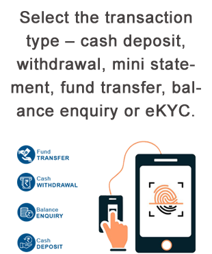 - Select the transaction type – cash deposit, withdrawal, mini statement, fund transfer, balance enquiry or eKYC.